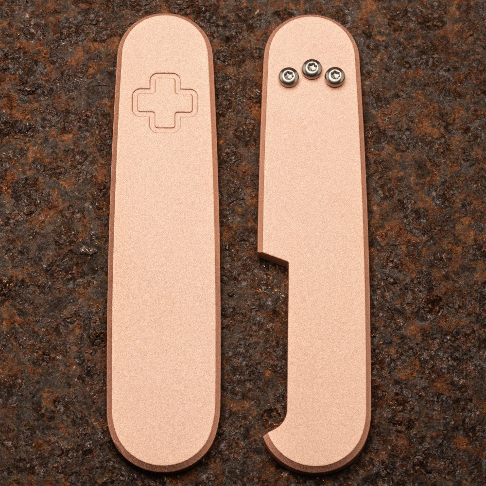Daily Customs 91.2 Plain Copper Handles provide a stunning upgrade for any Victorinox 91.2 mm (3.5-inch) Swiss Army Knife, turning it into a beautiful collector’s item. These rugged handles are both elegant and practical, providing a unique customization for your everyday-carry.