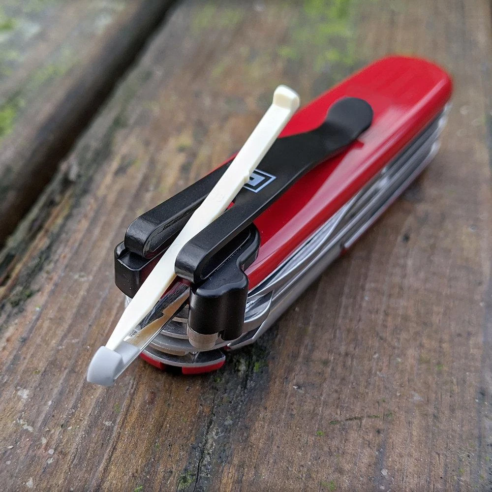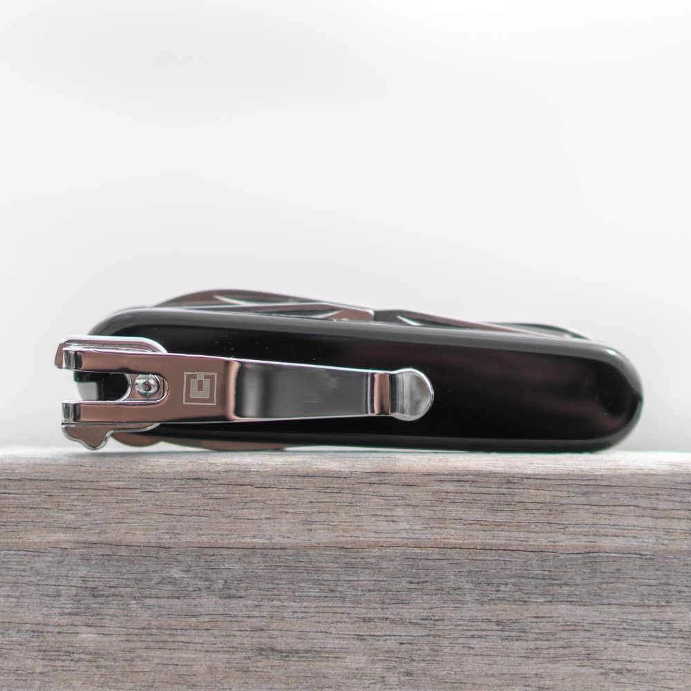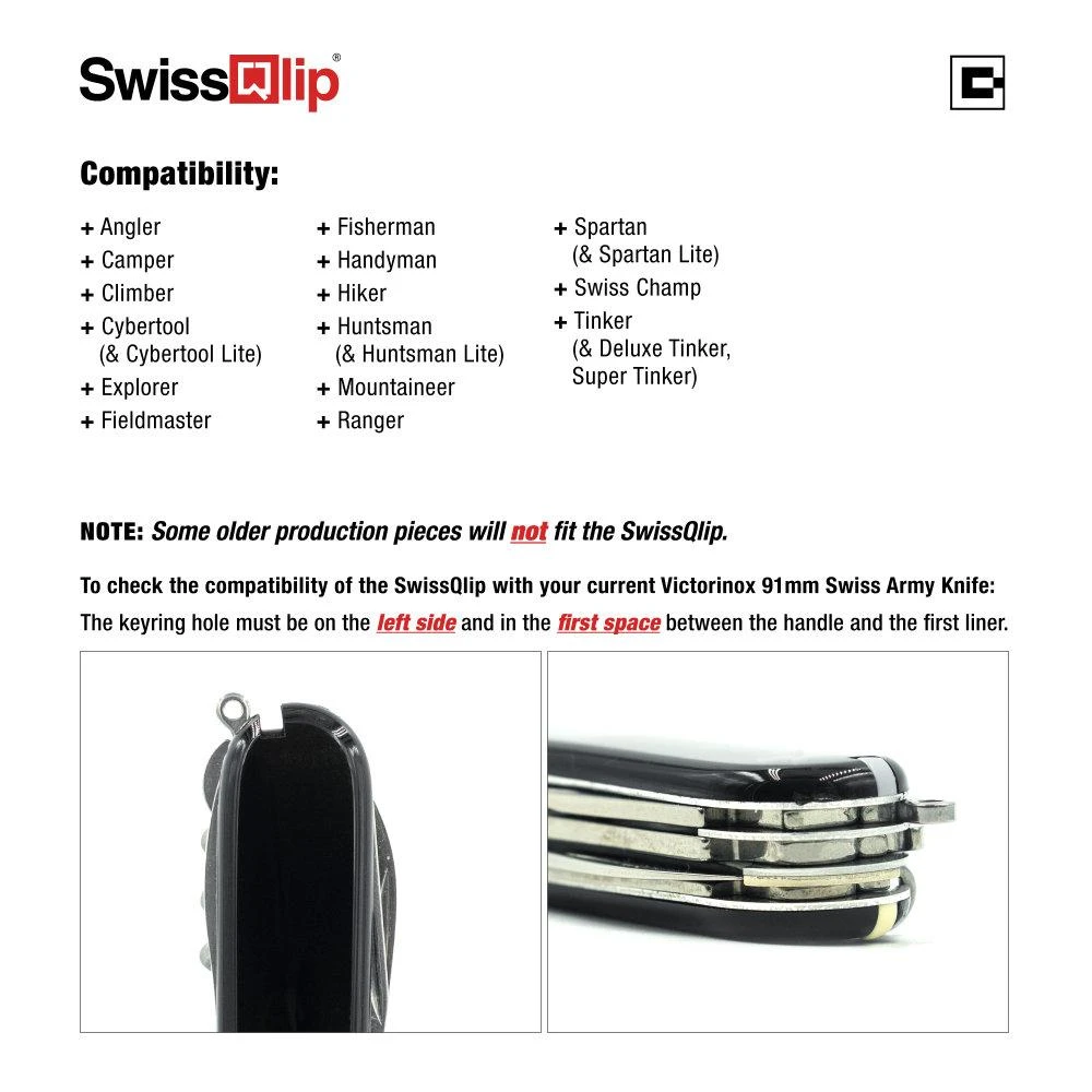 The SwissQlip is a rugged stainless steel pocket clip that attaches to nearly any 91mm (3.58 inch) Swiss Army Knife by Victorinox, making your favorite everyday-carry tool even easier to carry every day. (Please see below for compatibility details.)