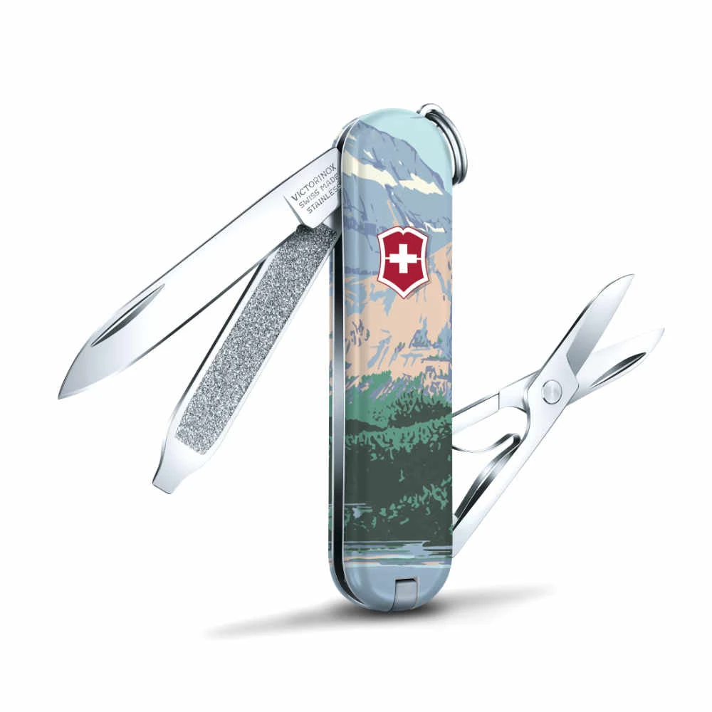 The GlacierĀ National Park Poster Art Classic SD Swiss Army Knife by Victorinox is a special edition Classic SD features the artwork of Doug Leen, AKA “Ranger of the Lost Art,” who strives to educate people about the importance of nature conservation. A former Grand Teton National Park Ranger, Doug Leen created this unique silk-screen reproduction of the New Deal Era National Park poster for Glacier National Park.